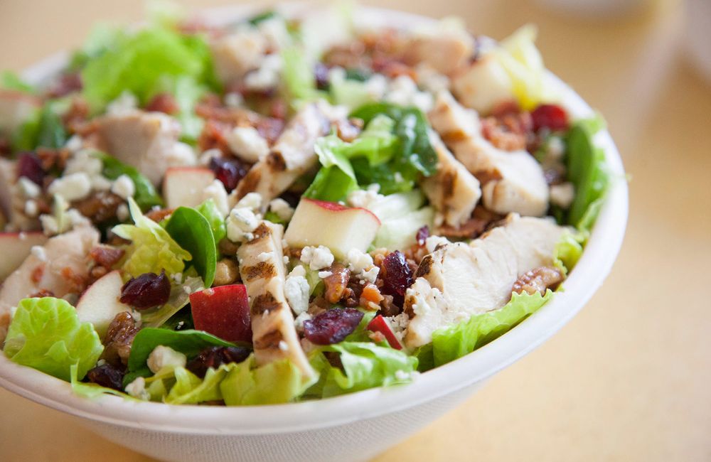 Chicken breast, hardwood smoked bacon, bleu cheese, honey roasted pecans, dried cranberries. Served with Apple Cider Vinaigrette.