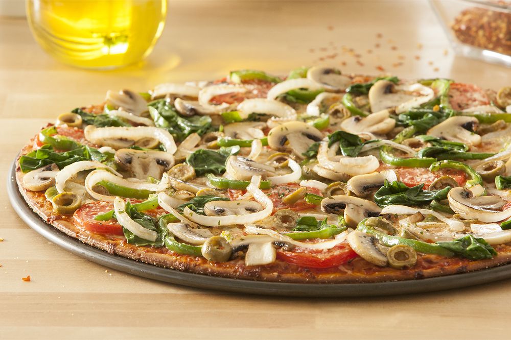 Freshly cut Roma tomatoes, green peppers and yellow onions, fresh mushrooms and baby spinach, green olives, smoked Provolone, Romano.